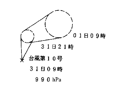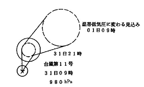 暴風域を伴わない台風(移動方向や速度がおおきく変わらない場合は、12時間後の予報円は省略される)
