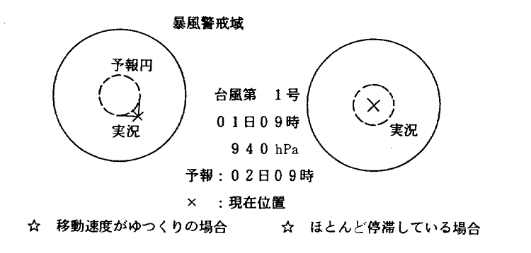 暴風域および暴風警戒域を持つ台風で、移動速度が遅い場合には、暴風域の円の記入が省略される(図が複雑となるため)。