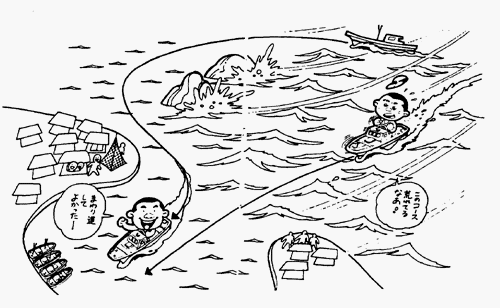 ブローチングは荒れた海面ほど起きやすく、またその度合も強くなりますから、時化てきたら遠回りでも、波高や潮流の少しでも穏やかなコースを選ぶとか、斜め追い波となるようなコースを避けるようにしましょう。