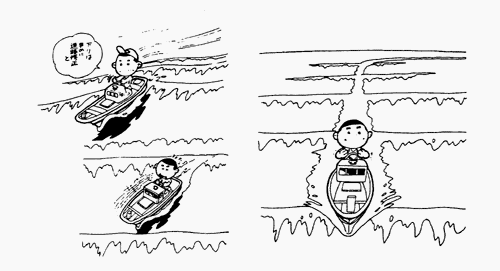 危険な海面は全速力で乗り切りたくなりますが、船首が前の波の谷に突込むと危険ですので、速力の増加は波の上り斜面で行ない、船体が波の頂上を越える少し手前から減速し、船首が前の波の谷へ突込むような状態になるのを避けましょう。