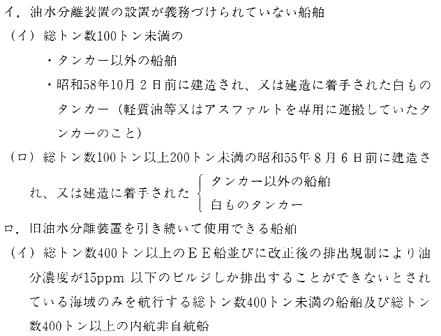 3.昭和58年の法律改正に伴う経過措置について 昭和58年の改正では、油水分離装置の技術的な基準が変更された。例えば、改正前に100ppm用と呼ばれていた装置でも、軽質油等を分離することができないため、原則として新しい基準に合格した装置に取り替えなければならない。(なお、内航船については施行日以後の最初に行われる船舶安全法上の定期検査又は中間検査の時期まで取り替える時期が猶予される。)しかし、次に示すように、特例が認められているものもある。