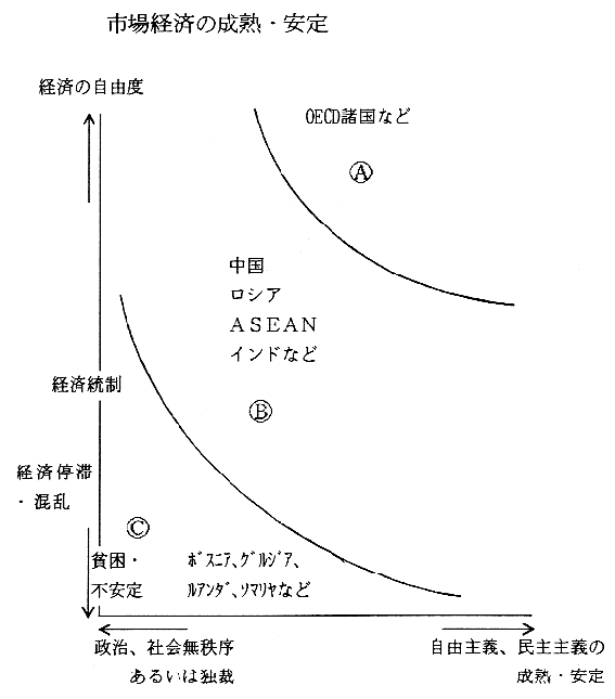 次の図は、経済と政治の状況と社会の安定度合いの関係についての一つの仮説の概念図である(東京大学助教授・田中明彦氏の作成した図を修正)。アジアは経済発展の中で地域紛争が管理され、戦後最も平和な状況(アジア・モデル)。