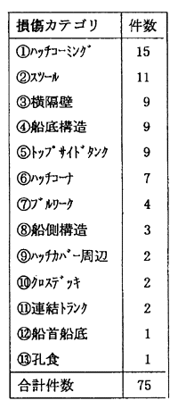 現在の設計がどのようになっており、どこに問題点があるかを把握するため、損傷例の調査と構造データの収集とを行った。損傷例は75例を収集し、これをカテゴリ(損傷部位)別に整理すると表1に示すようになり、また発生年代別に整理すると図1に示すようになる。これらを詳細に検討し、参加各社の経験と照らし合わせて、基本的な検討が必要な項目として横隔壁スツール基部、トップサイドタンク、クロスデッキ、船底構造(ビルジホッパナックル部)を選んで以降の研究で検討した。