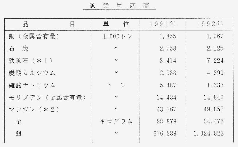 鉱業は、1992年にGDPの8.2%を寄与し、就業労働力の1.8%を占めている。