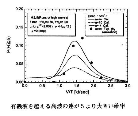波のスペクトルのバンド幅パラメータを用い、波群や連の大きさを推定するLonguest- Higginsの方法を出会波に適用し、追波中を航行する船が出会う波の群波性が海洋彼自体の群波性と異なり、船速/波周期が1.0〜2.0(kt/sec)の範囲で高波の連に出会う確率が大きくなることを定量的に示した。
