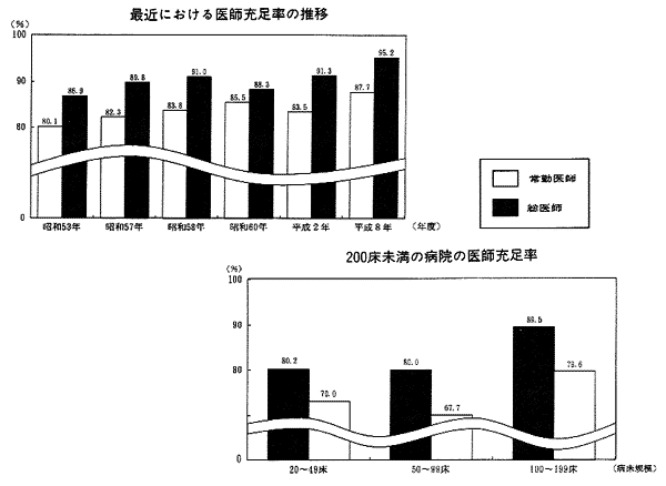 しかしながら、主として農山村、漁村、離島等においてへき地医療の確保に重要な役割を果たしている200床未満の病院についてみると20〜49床70.6%、50〜99床67.7%、100〜199床79.6%と未だに70%台で著しく医師不足の実態を示している。ただ、200床未満の病院の非常勤医師(常勤換算)も加えた総医師についてみると、20〜49床80.2%、50〜99床80.0%、100〜199床89.5%となっている。