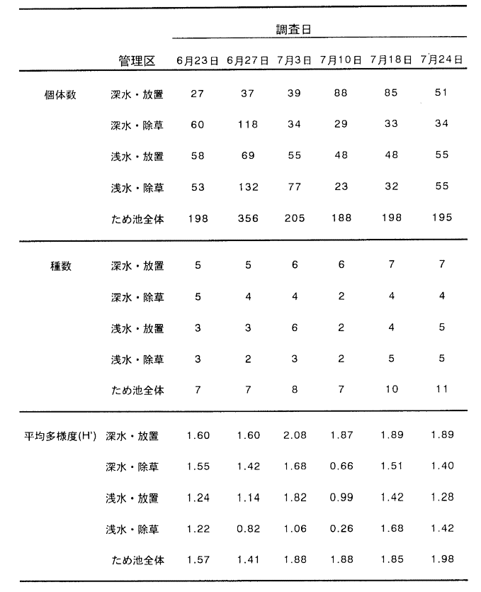表5-1.1996年5月中旬に大阪府豊能町の山間部に休耕田を利用して造成したため池で同年6月から11月に各管理区とため池全体で確認された水生昆虫群集の補正のべ個体数、種数および平均多様度(H')。
