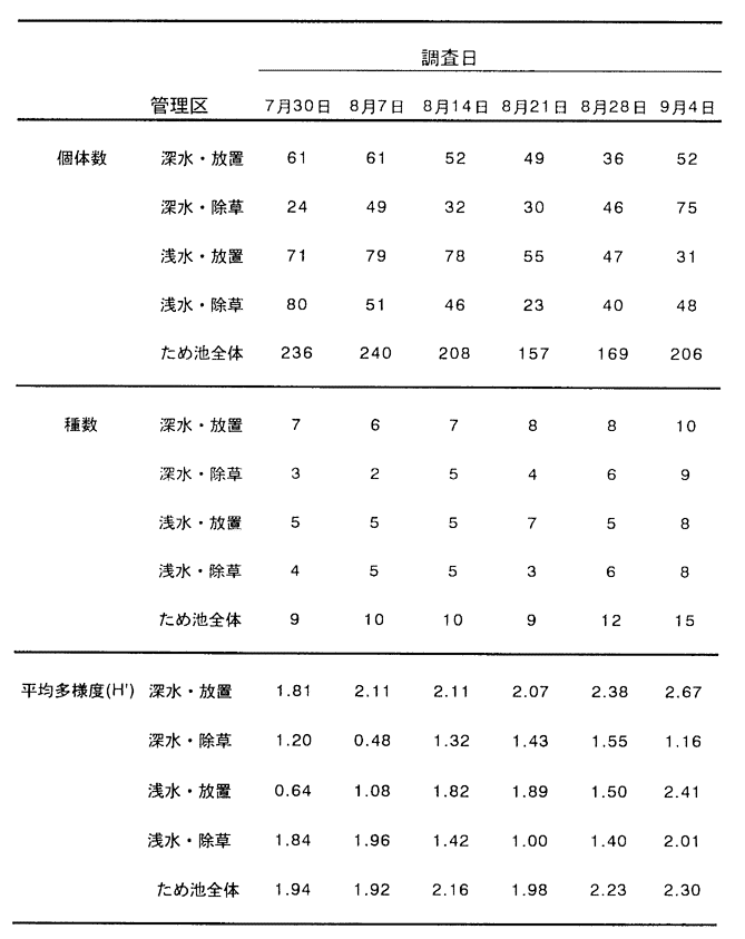 表5-2.1996年5月中旬に大阪府豊能町の山間部に休耕田を利用して造成したため池で同年6月から11月に各管理区とため池全体で確認された水生昆虫群集の補正のべ個体数、種数および平均多様度(H')。