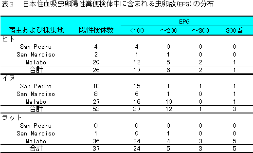 1) 糞便中に含まれる虫卵数の算出 被検糞便lg中に含まれる日本住血吸虫の虫卵数(eggs per gram,EPG)を算出した結果を表3に示した。各保虫宿主の感染率が高い傾向を示した Malabo 地区では、EPG値も高い検体が多い傾向がみられた。これは感染源と住宅の密集地が近接している地区では、地区全体の感染率が高いのに加えて、各個人が繰り返して感染を受けるために感染の程度も重くなることを示すものと考えられた。
