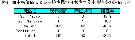 表6はその結果を示している。今回は、検体のほとんどが Malabo 住人のものであり、他の地域の検体がごく少数であったので地域間の比較は出来ないが、多数の検体を集めることが出来た Malabo 地区では、陽性率が43.4%と一般住民の抗体検査でも小学校児童の血清検査と同様にかなり高い値を示した。小学生と比較して、一般住民ではその行動範囲も多様であると考えられるため、この結果から単純にその村落の感染源汚染の度合を評価することはできない。しかしながら、住民の2人のうち1人が抗体陽性という結果は、この地域が日本住血吸虫症のかなり高度な浸淫地であることを示しており、殺貝剤の散布などのコントロール対策を早急に実行する必要があると考えられた。