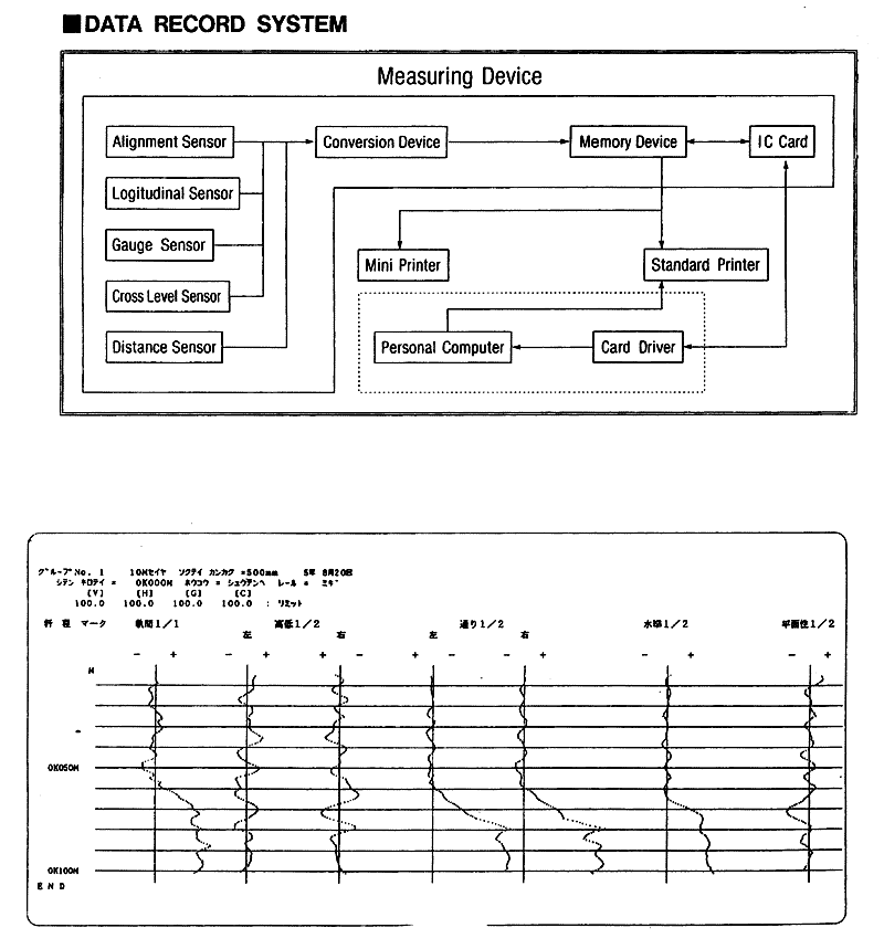 The measuring items are irregularities in track gauge,alignment,longitudinal level,cross level,rail joints,structures,etc.,in addition to travelled distance.