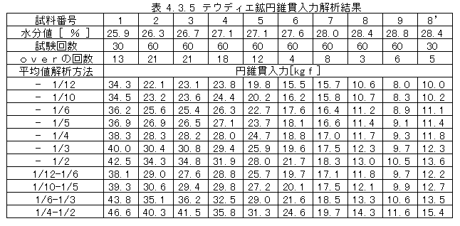 準備していただいた状態での試料の水分値計測結果は、円錐貫入試験実施後に得られたため、試験においては、過去の経験から水分値を推定して水分調製を行つた。最初の