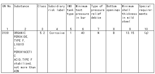 主要点:有機過酸化物F(液体)、過酢酸(安定剤入りのもの)(Fに該当するもの)(濃度が43質量%以下のもの)、クラス5.2、UN3109の現状の容器及び包装に加え、ポータブルタンク、金属及びプラスチック製内容器付複合IBCs(31HZ1)による海上輸送を許可し、また、硬質プラスチック性IBCsを使用する過酢酸の濃度を17%から43%に増加する。