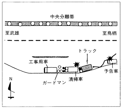 警備員Dは、路面清掃車ブラシの下敷きで、警備員Eは路面清掃車と工事用車両間に挟まり、両名ともすでに死亡と思われ、救出するのに困難な状態。