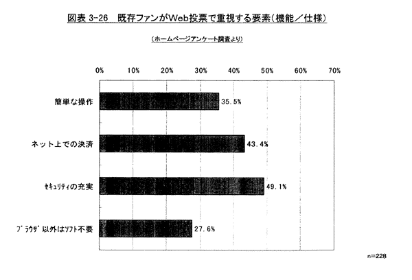 既存ファンにより望まれるユーザーインタフェースの機能、仕様面は、投票時、情報取得時の簡単な操作を望む割合が比較的低く、セキュリティの充実が重視されている。