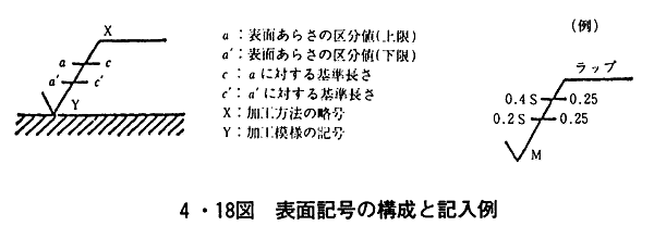 表面記号は厳密に指定する場合に用いられるもので,表面あらさの区分値,基準長さ,加工方法の略号,加工模様の4つの記号を4・18図のように記入する。ただし,これらの記号は特に必要がない場合は省略することができる。表面記号に用いる加工方法の略図を4・3表に,又加工模様の記号を4・4表に示す。