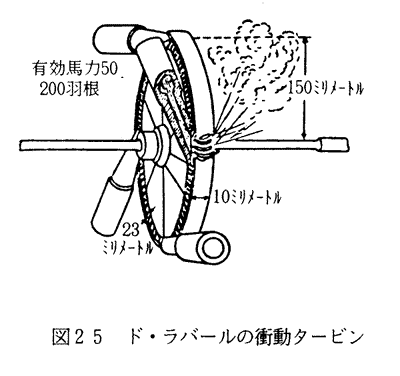 図25のド・ラバールタービンは,蒸気が動く羽根を通過するときに同じ圧力を保ち,その速力によってのみ働きかけるから,このタービンは衝動タービン又は等圧タービンといわれる所以であるが,これとは反対にパーソンスタービンは反動タービン又は不等圧タービンといわれている。これは,図26にみるとおり固定された案内羽根と回転羽根とがあって,蒸気がこれらの羽根を通過するときに圧力が減圧されるからである。図27は案内羽根と回転羽根の形を示し,蒸気の通過する道を示した簡略図である。