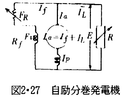 このときOF1を界磁抵抗線といい,無負荷飽和曲線の直線部分に重なる直線OF5に対する界磁回路の抵抗を臨界抵抗という。この値を超える電圧の発生は行われない。外部特性は次のようにして測定する。FRによりほぼ定格電圧に合わせ,徐々に負荷電流を増加し,定格電流になったら端子電圧及び速度も定格値に合わせる。次にFRを固定し,負荷電流をいったん約125%に増大し,その点から端子電圧を測定しながら徐々に負荷を減少し無負荷に至らしめる。各負荷での回転速度を定格値とすれば発電機単独の外部特性を得る。測定した電圧を負荷電流に対してプロットし,図2・29の特性を得る。電圧変動率は次の式により求める。