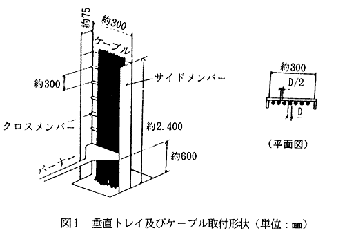3 試験装置 (1)燃焼試験室は、ケーブルの燃焼試験時にケーブルの燃焼を助長させないような自然換気に近い室又は燃焼用バーナーの火炎が不安定にならないような強制換気を行った室とする。 (2)試験は垂直トレイ試験とし、また、垂直トレイは図1に示すような高さ約2,400mm、幅約300mm、奥行き約75mmの金属製オープントレイとする。この場合において、トレイは、燃焼に影響を与えないような適当な支持物で垂直に固定する。