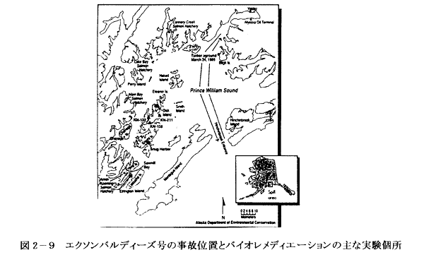 1989年3月24日にアラスカ湾で起きたエクソン・バルディーズ号の座礁事故では410,000 klもの大量の油が流出し、沿岸部に漂着したが、その処理方法の一つに手作業、物理的処理法(ステーム洗浄、高圧水、高温水洗浄、機械による堆積物除去や耕転など)、化学的処理法(分散剤の散布、海岸洗浄剤)と並んでバイオレメディエーションが採用された。そのほとんどは現場での栄養剤の付与であったが、酵素添加や微生物添加の室内実験も行われた。栄養剤の添加は?@実験・モニタリング計画により室内実験、現場での実験などで効果を評価したあと、大規模な適用が行われるなどの手順を踏んで行われたこと、?A冬季は除去作業も困難で、微生物の活動も活発でないことから、4年間にわたり、夏期に限定して行われたこと、?B除去の経費はEPAとエクソン社が分担したことなどの特徴がある。