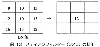 対象とする範囲内のピクセルのデータ値について中央値(例えば9×9では小さい方から(大きい方からでも同じである)41番目の値)を求めて中央のピクセルの値とするフィルターであり、雑音除去を目的に利用されることが多い。図13に3×3のメディアンフィルターの動作を模式的に示した。