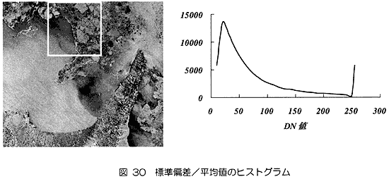 流氷と海面を含む部分画像の位置とその部分画像のヒストグラムを図30に示した。ヒストグラムからは適当な閾値を設定することはできなかった。