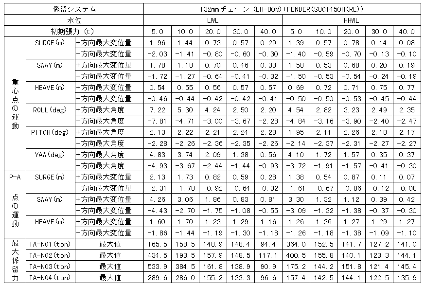 初期張力はNo1〜4が20t、暴風時の最大動揺量がSurgeで最大0.87m、Swayで最大1.12mである。チェーン張力は最大151tである。