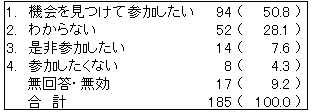 ●「参加していない」が最も多いのは、回答数の約6割が寄居と隣接町村以外からのものである点を割り引いて止むをえないと考えたらよいのか、それとも、たまに開かれるイベントであればこそ、もっと域外の会員の参加がほしいと考えたらよいのか、意見が分れるところである。