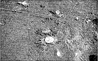 アカテガニというのは、海岸沿いに暮らしてる方はよくご存じかと思うんですけれども、陸のカニです。海辺とか川辺にももちろんいるんですけれども、山の中にもいます。スライドは、やや湿った岩にひっついているアカテガニですが、乾燥した尾根にもいますし、木にも登っている、山のカニ、森のカニなんですね。標高80メートルぐらいの一番高いところがら川沿いまで、小網代の谷全域、ありとあらゆるところにいます。ところが、このカニ、サワガニなどとは違って子どもは海で育ちますので、実は夏の満月と新月の大潮の晩に、メスガニが子どもを海に放しに、山から海岸へ出ていきます。放された子どもは、あとで出てきますが、ゾエアという不思議な幼生になって約3週間ぐらい海で暮らします。そのあと、メガロパという、また次の段階の幼生になって、10日前後海で暮らして、夏の終わりから秋にかけて、もう一度海から小網代の岸辺に戻ってきて、そこで脱皮して子ガニになって、山へ帰ってゆく。そういう暮らし方をしてるんです。親は山で暮らし、子どもは海で暮らす。生まれるのは干潟の縁。小網代というのは森のある谷と干潟と海がセットの生態系なんですが、この生態系を一つも欠かすことな く必要として暮らす、生き物です。