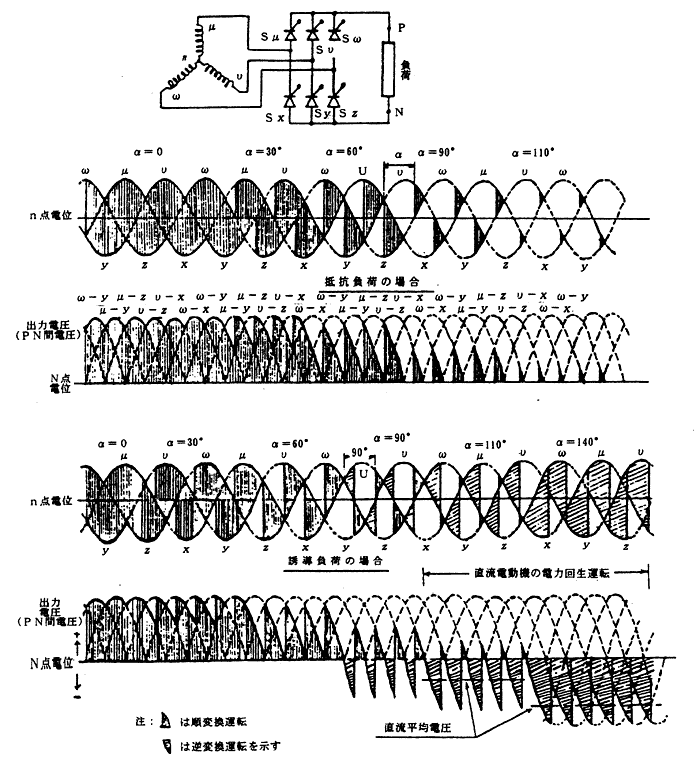 (e) 三相全波純ブリッジ 出力電圧の脈動が少く、高い制御性能をもっている。直流電動機を接続する場合は、電力を電源に逆変換するインバータ運転が可能である。 抵抗負荷:α=120°で電圧零となる。 誘導負荷:α=90°で電圧零となる。