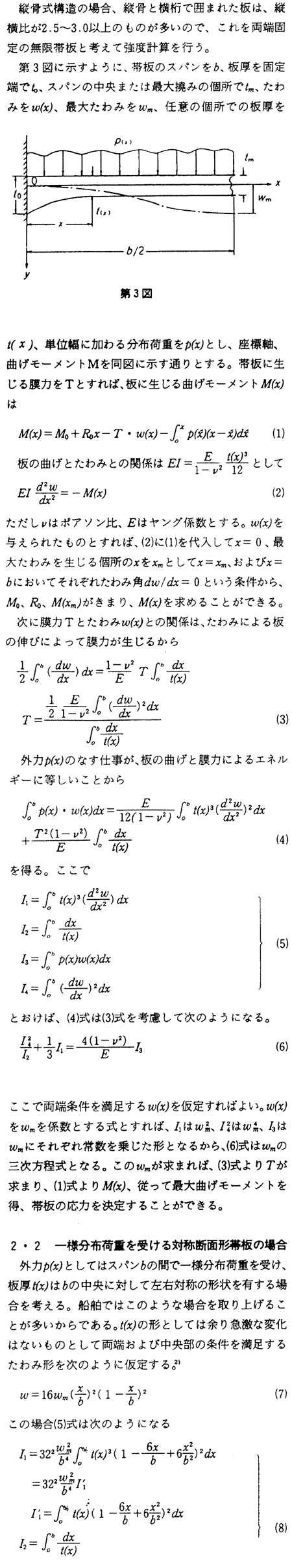 本文はこの型材の板の部分の設計法を実用上の見地より述べた。特に防とう材との接合部付近をテーパーとした場合は、アルミニウム合金の場合だけでなく、FRP構造の場合の防とう材との積層部をこのようなテーパー部に置きかえて設計することも可能である。(第2図) 2. 強度計算 2.1 基礎方程式 前ページ 目次へ 次ページ