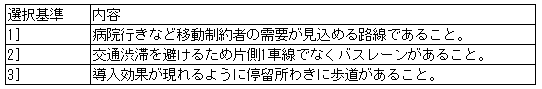 これらの基準をもとに選択された路線では、1時間に1本程度運行(将来目標は、1時間に2本)されているが、市内には4m未満の狭い道路も多く、市内で偏りなく運行しているわけではない。