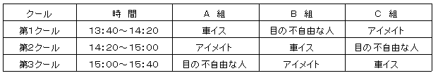 ■参加者はA、B、C、の3組に分かれて、講師や障害をお持ちの方と一緒に移動しながら3種類のサポートコースを全て体験する