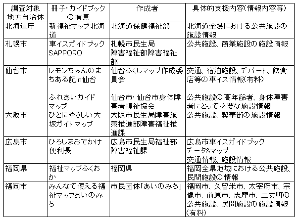 どこの駅、どこのターミナルのどの場所にエレベーター、エスカレーター、障害者用トイレ等があるかという情報については、各交通事業者が冊子、ガイドブック等を作成している場合が多い。特に「車イスガイドマップ」については、一定の人口(概ね30万人)以上の都市では、かなり整備されている。また、交通施設を含めた街全体、利用者が多い特定の路線の情報提供については、社会福祉協議会、あるいはボランティア団体が冊子、ガイドブックを作成している場合があった。地方自治体が前面にたって冊子やガイドブックを作成していることは少なかった。