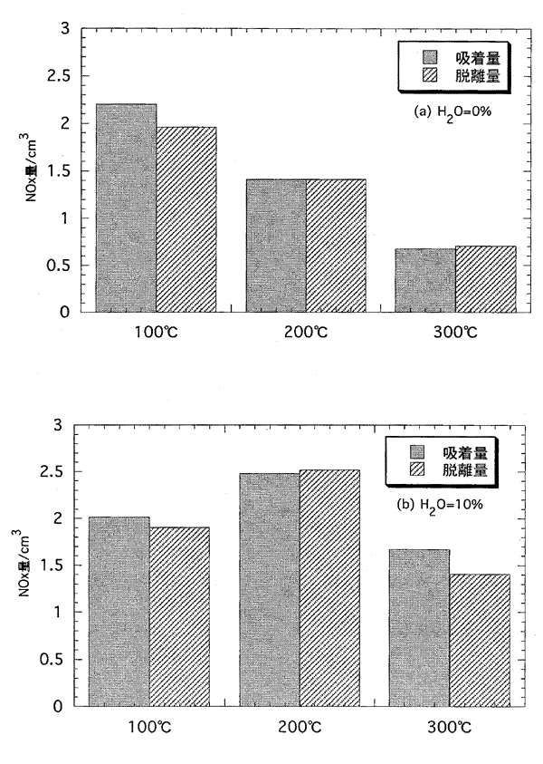 吸着剤:Mn2O3・2ZrO2(550℃焼成、Mn:Zr=1:1) 反応条件:NO=1,000ppm;O2=10%;SV=15,600h-1;ガス流量=100cm3・min-1; 昇温速度=10℃・min-1;吸着時間=60min. (a),H2O=0%;(b),H2O=10%
