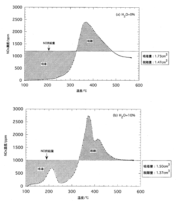 吸着剤:Mn2O3・2ZrO2(550℃焼成、Mn:Zr=1:1、Ar中熟製品) 反応条件:NO=1,000ppm;O2=10%;SV=15,600h-1;ガス流量=100cm3・min-1; 昇温速度=10℃・min-1. (a),H2O=0%;(b),H2O=10%.
