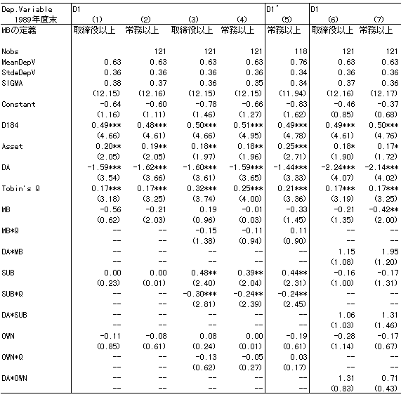 2. MBダミー; 企業自らが特定した銀行が、銀行中株式保有順位が1位で、かつ、取締役(常務)以上の地位に役員を派遣している場合に1をとり、それ以外はゼロをとるダミー変数。