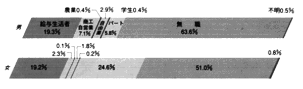 扶助を受けた人の職業では、全体の半数が無職となっており、給与生活者は男女とも19%にとどまっています。