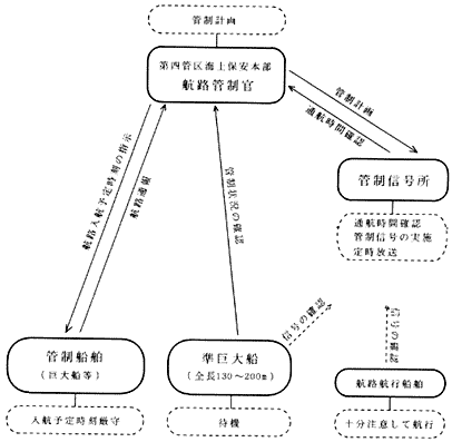伊良湖水道航路管制信号所は伊良湖岬灯台付近に位置し、伊良湖水道南口から伊勢湾、三河湾口を一望できる。管制信号所には常時1名が交代で勤務している。実際の管制業務は第四管区海上保安本部航路管制官が行っており、信号所では管制船舶の通航時間の確認、管制信号の実施、1,665kHzでの定時(毎時25分〜30分)放送を行っている。通航船との直接の交信は行っておらず、指示、連絡等の通航船との交信は航路管制官が行っている。下図に今回現地にて確認した航路管制の状況を示す。