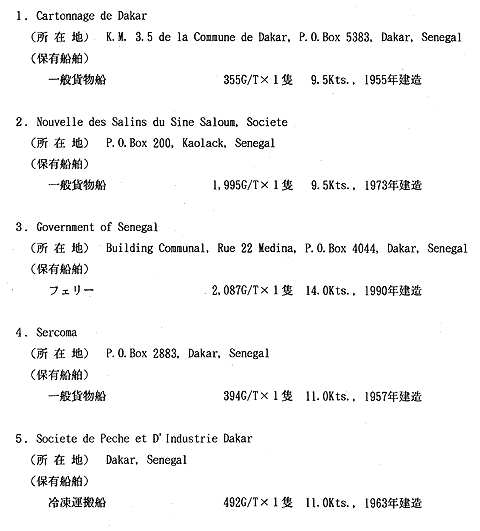(B)海運事情と保有船主の実態 セネガルは、河川による内陸水運が発達しており、貨客輸送に重要な役割を果たしている。 セネガル川は水量が豊富で、河口のサンルイス港から924?上流のマリ国カエス港まで船舶の航行が可能である。 サムール川はカオラク港まで、カサマンス川はジグインショル港まで常時遡行が可能である。 セネガルにおける主な海運会社は、次の通りである。