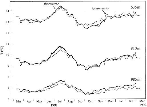 Figure 5a shows a comparison of the rms error (in milliseconds) for three different predictions of about 450 AMODE travel times, and rms error in degrees (Fig. 5b) for 18 moored thermistors (3 on each mooring). The larger the values, the poorer the predictions. The solid line gives the rms misfit for the‘climatological’prediction, guessing zero for the ocean perturbation state at all times. The long-dashed line shows the error results from a QG model forecast from an optimized initialization using 12 days of travel time data (the moored thermistor data were not used). The short-dashed line is a persistence forecast from the same initialization. Using 12 days of moored travel time data to initialize the model, the travel time variability caused by eddies can be predicted for at least 60 days before the model prediction is worse than a climatological guess of zero (persistence alone becomes worse than climatology after about 25 days), consistent with prior estimates of an“eddy turnover time”. Even at the start, the model predictions have rms errors of about 25% of the total data rms, due to ocean variability not included in the QG model, such as surface processes and water mass interleaving.