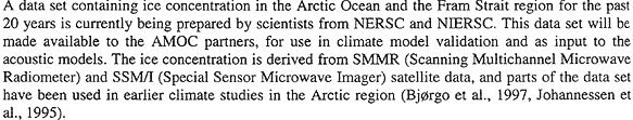 The contents of these data sets, and the parameters extracted for model runs in the first year of the AMOC project, are described in the technical report for task 1 (Hamre et. al., 1998). From the initial list of sources, the focus was directed to the two Arctic Ocean Atlases from the Environmentai Working Group consisting of leading U.S. and Russian scientists. These atlases, available as CDs, contain winter and summer climatological data from the 1950s, 1960s, 1970s, 1980s and 1950-89. Parameters available are temperature, salinity and density, which are needed for both climate and acoustical models. The parameters are gridded, with 50km resolution, and covers the entire Arctic Basin as well as the Fram Strait. Unfortunately, the original raw data were not included on the CD. From these CDs, the AMOC partners had agreed to extract 3 profiles for use in test and validation runs of the acoustic models, see Fig. 2: