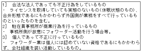 現在、正規の国際貨物フォワーダー業(貨運代理店)は1400〜1500社程度とみられているが、不正規なものは6000社程度といわれている。これらの不正規業者をいかに淘汰し、業界の健全な発展を期するかが大きな課題となっており、不正規な業者は特に香港やマカオの業者に多いとされている。経済貿易合作部では不正業者の摘発を中心にフォワーダーの整理を行う運動を活発化させており、業者のチェックが厳しくなっている。