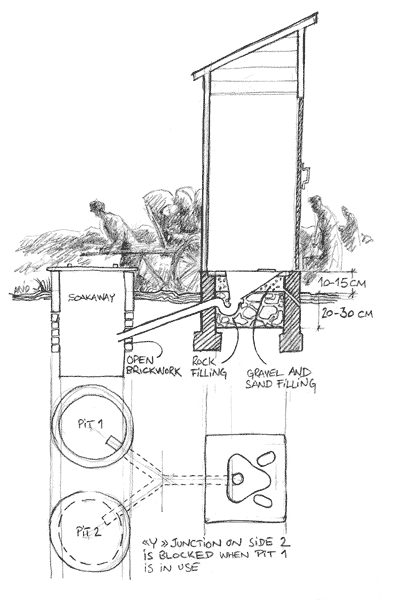 52. し尿を不透水性の土壌で処理しなければならない場合、特に高温地帯では安定化(酸化〈oxidation〉)池を利用すれば、簡単かつ安価ですむ。各種システムについては、技術資料の説明を参照。池を使用する場合は、安全上、囲いなどを設ける必要がある。