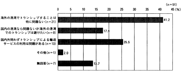 上記の相手地域との輸送において長崎港を利用する際のトランシップについては、「海外の港湾でトランシップすることは特に問題ない」が最も多く、41.2%となっている。また、「国内外を問わずトランシップによる輸送サービスの利用は問題がある」「国内の港湾なら問題ないが、海外の港湾でのトランシップは避けたい」がそれぞれ25.5%、17.6%となっている。