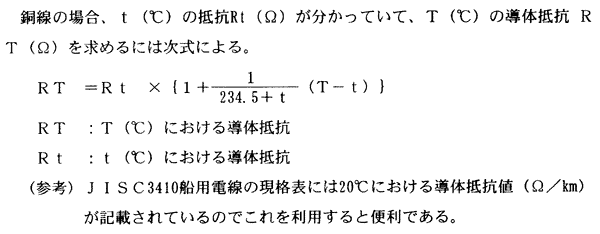 (5) ケーブルの電圧降下の計算 レーダー用船内電源の入力回路などで、ケーブルの導体抵抗による電圧降下を算出する場合には、以下の計算による。特に、直流 100ボルト未満の船内電源を用いるレーダーの場合、ケーブルによる電圧降下が大きく影響するので、使用するケーブル心線の断面積と布設の全長に注意が必要である。 (a) 導体の抵抗は、長さに比例し、断面積に反比例する。