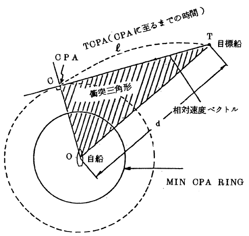 捕捉した物標は、その後の動きを連続的に自動追尾され、その追尾の結果として求められる自船に対する方位と距離の変化を計算機に入れるとともに、ある条件の下に、過去の位置のデーターも記憶しておく。このとき、図6・7に示したように、自船Oから相手船Tの相対針路TC上に垂線を下ろしてその足をCとすると、OT、OC及びTCで三角形が構成されるが、このときの点Cを目標の最接近点=CPA(Closest Point of Approach)といい、この最接近点に到達するまでの時間、すなわち距離lを、相対速力VRで割った時間(l/VR)をTCPA(Time to CPA)という。また、OCは最接近点までの距離で、RCPA又はDCPA(最接近点距離)という。ただ、一般的には単にCPAということが多い。また、このようにして作られた三角形を“衝突三角形”と呼んでいる。