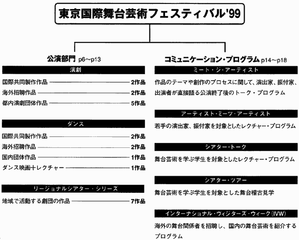 東京国際舞台芸術フェスティバル'99は、公演部門とコミュニケーション・プログラムの2つの部門で構成された。