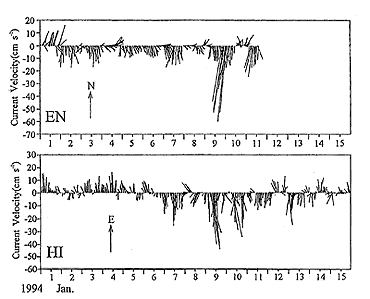 Fig. 2b shows the time series of the current and temperature at station HI during the same period as those at EN. The increased westward current and steep rise of temperature occurred on January 9, the same day as the thermal front passing at EN. The maximum westward current was 0.52 ms-1 at 5:00 at HI, which is nearly the time of the temperature rise. The westward current at HI and the southward current at EN indicate an anticlockwise current in the bay, as easily seen from the current direction and the observation sites (Fig. 1). The maximum speed was smaller at HI than at EN, and the former led the latter by about 18 h. In the current records at HI (Fig. 2b), the tidal current fluctuations existed through the entire period with amplitude of 0.1-0.2 ms-1 as well.