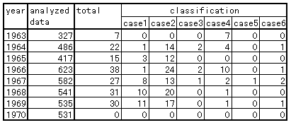野帳の保存状態の異なる1970年以前と、1971年以後に分けて、重複データ発生状況を検討した。1970年以前の期間でのエラー発生状況をTable3に示す。Table3aが「観測資料」(1968年4月以降1970年までについては観測野帳)によるミスタイプのチェックを行う前、Table3bがチェック・訂正を行った後の結果である。これらの表では、左から解析したデータ(測点)数と、重複ないしは重複の可能性の高いデータの数を示している。次のcase1からcase6は、Table2の分類によるcase毎の発生頻度である。1970年のデータには重複データが1つも現れていないが、1963年から1969年の期間については、重複の可能性の高いデータは、Table3aおよびTable3bともに、解析したデータ数の約5%に達する。2つの表を比較して、「観測資料」または野帳によるミスタイプのチェック・訂正の効果は、余り現れていないことが分かる。ただし、1963年のデータの1つが観測日時のタイプミスから、別測点のものであることが判明した他、1966年の1データがcase4からcase2に移り、1968-69年のcase2の若干数のデータがcase1に移っており、チェックの結果、僅かではあるが、より「完全一致のcase1」に近づいた。